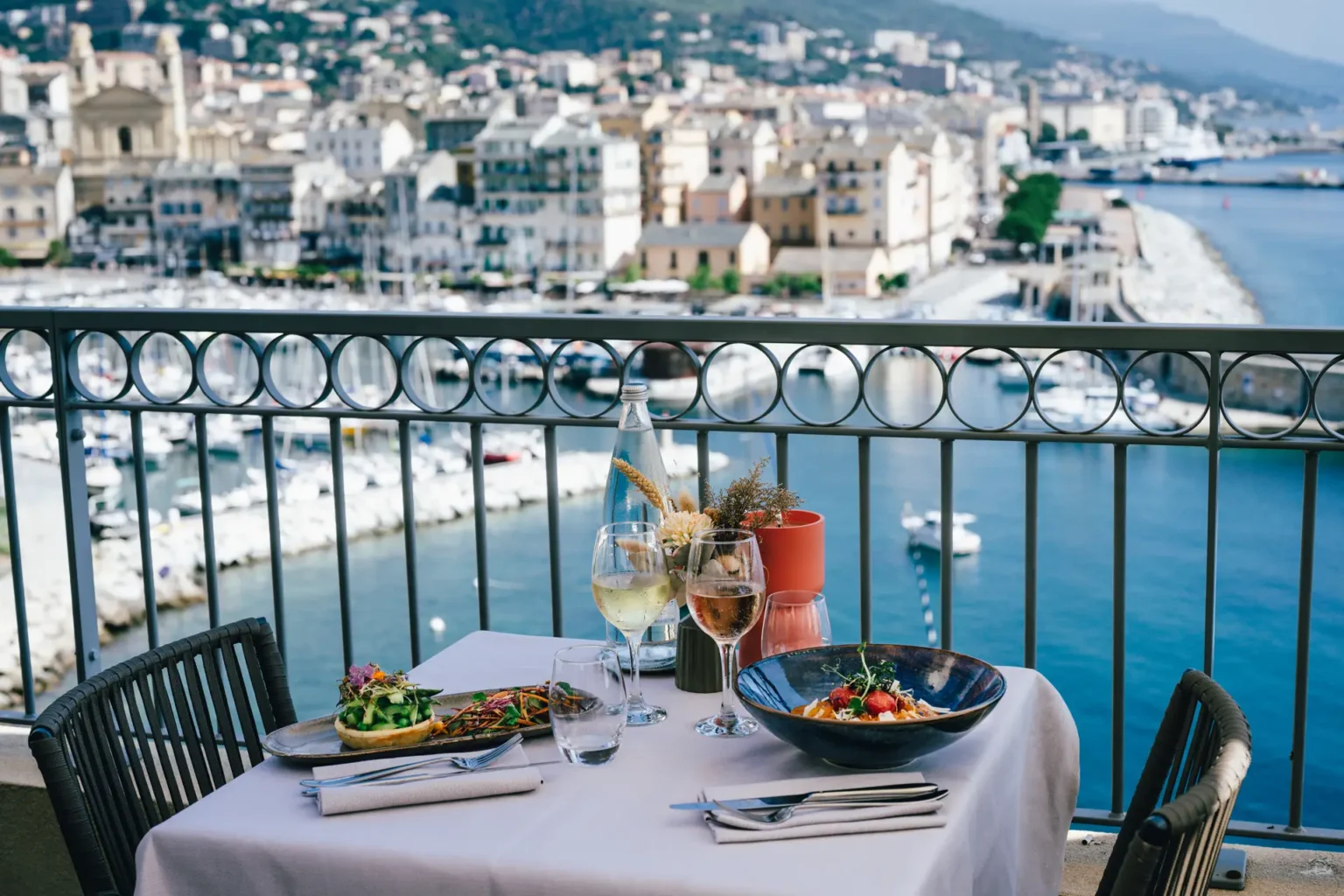 La véritable singularité de La Table des Gouverneurs réside dans son emplacement exceptionnel. Depuis la terrasse, les convives profitent d’un panorama saisissant sur la mer, le port de Bastia et les reliefs corses.